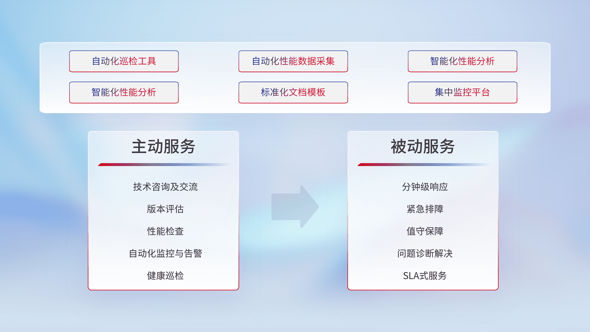 智能化工具和标准化文档,,保障服务质量,,,提供主动服务(包含技术咨询、、、、版本评估、、性能检查、、自动化监控与告警、、、健康巡检)和被动服务包含(分钟级响应、、、紧急排障、、、、值守保障、、、、问题诊断解决、、、SLA服务)。。。。